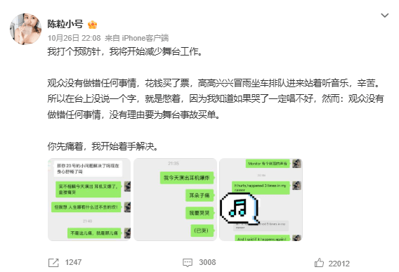 △据陈粒发布的聊天记录,她与朋友对话时称“今天演出耳机又爆了,直接痛哭”、“已经发生3次了”