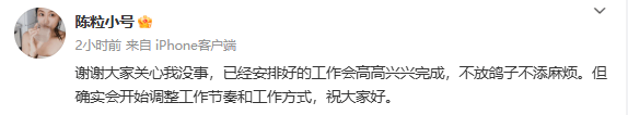 随后,陈粒再发文,表示已安排好的工作会高高兴兴完成,“不放鸽子不添麻烦,但确实会开始调整工作节奏和工作方式。”