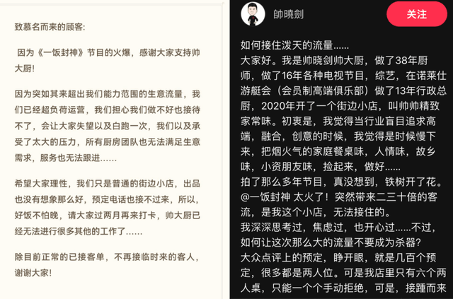 帅晓剑帅大厨在小红书发布长文表示「突然带来了二三十倍的客流」,而据小红书用户晒图,红棉餐厅的预约也已经排到了11月之后。除此之外,每天都还有用户在复刻大厨们的同款菜肴。