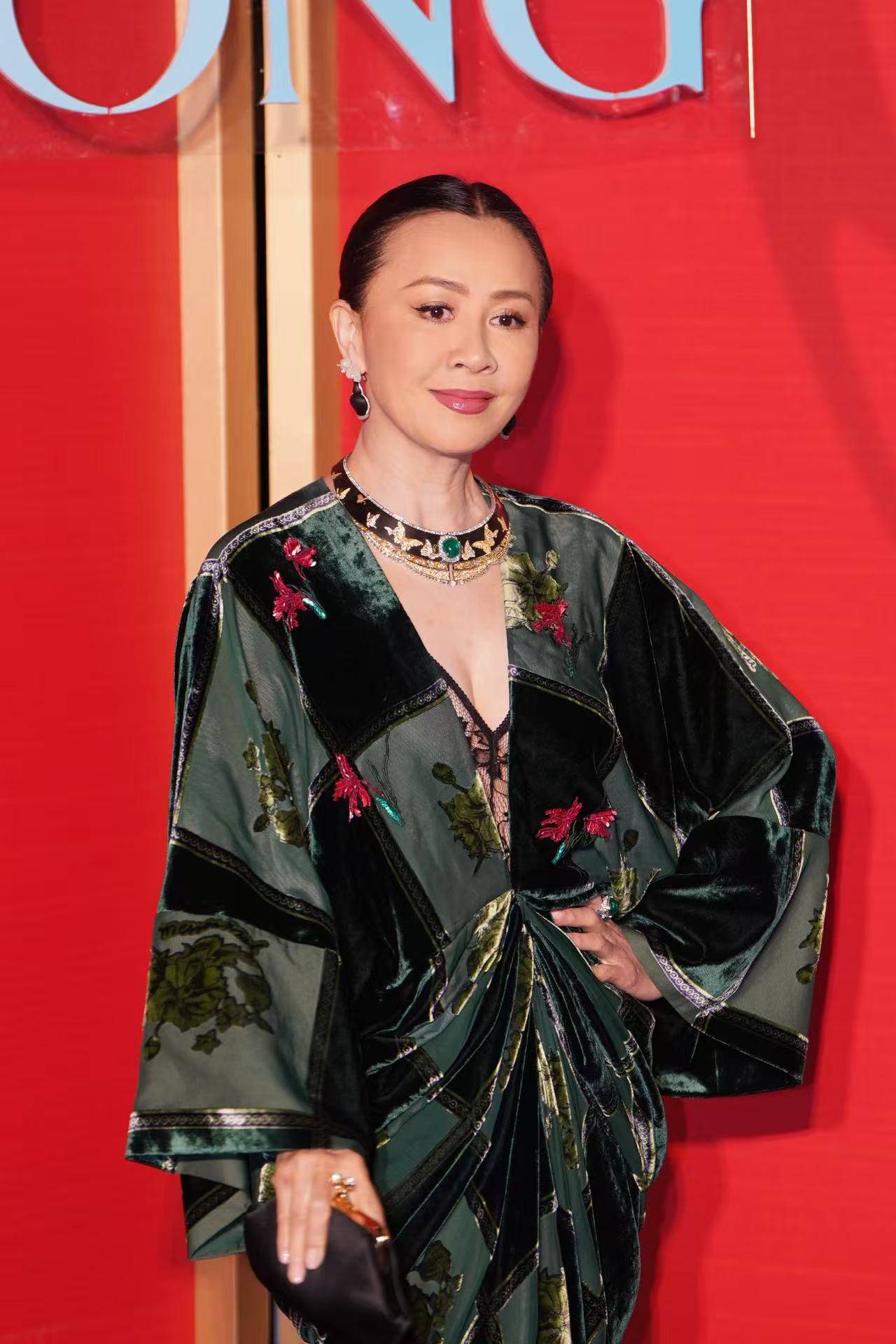 刘嘉玲绿色丝绒礼服搭配珠宝,整个人珠光宝气。
