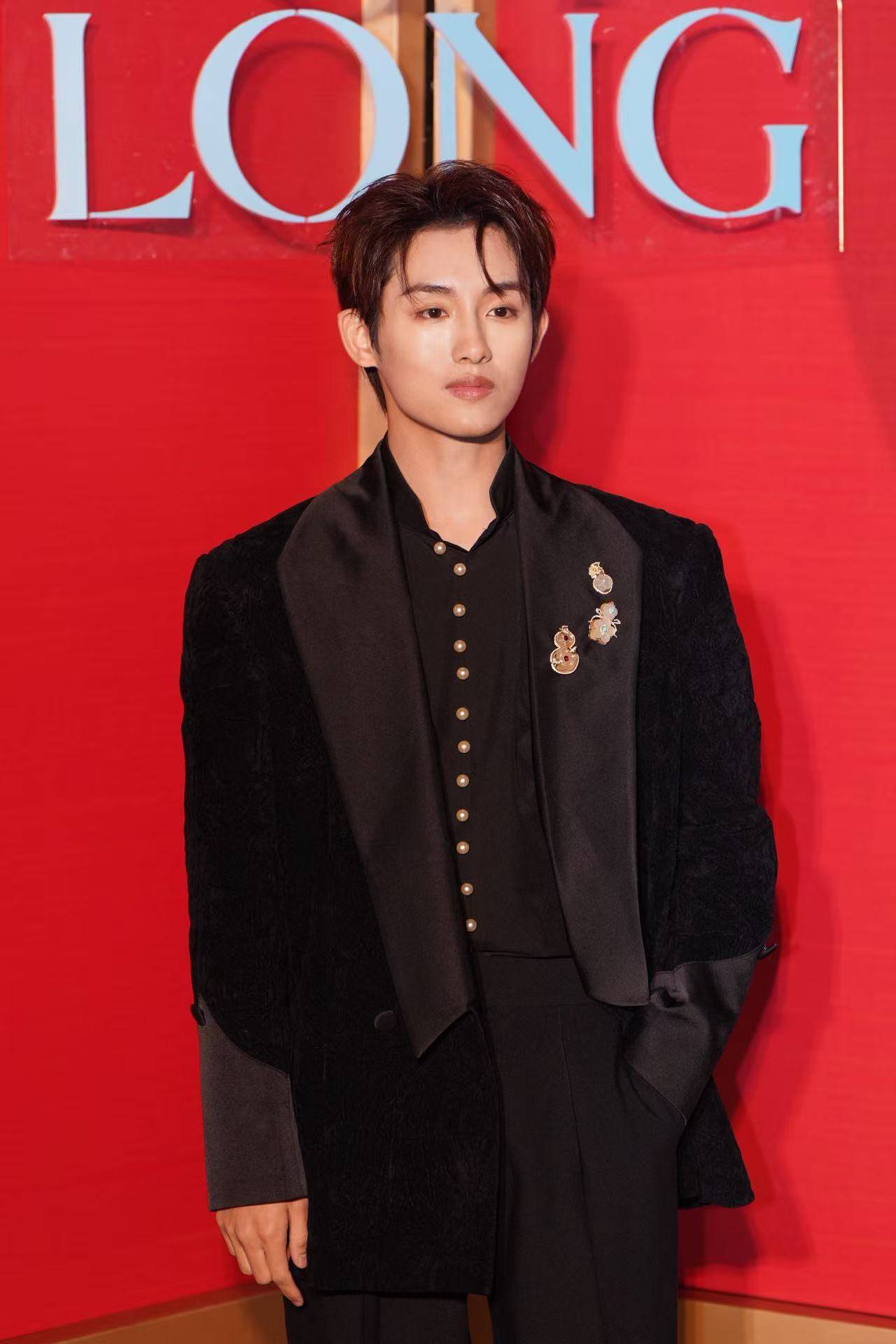 董思成黑色西装搭配胸针,帅气矜贵。