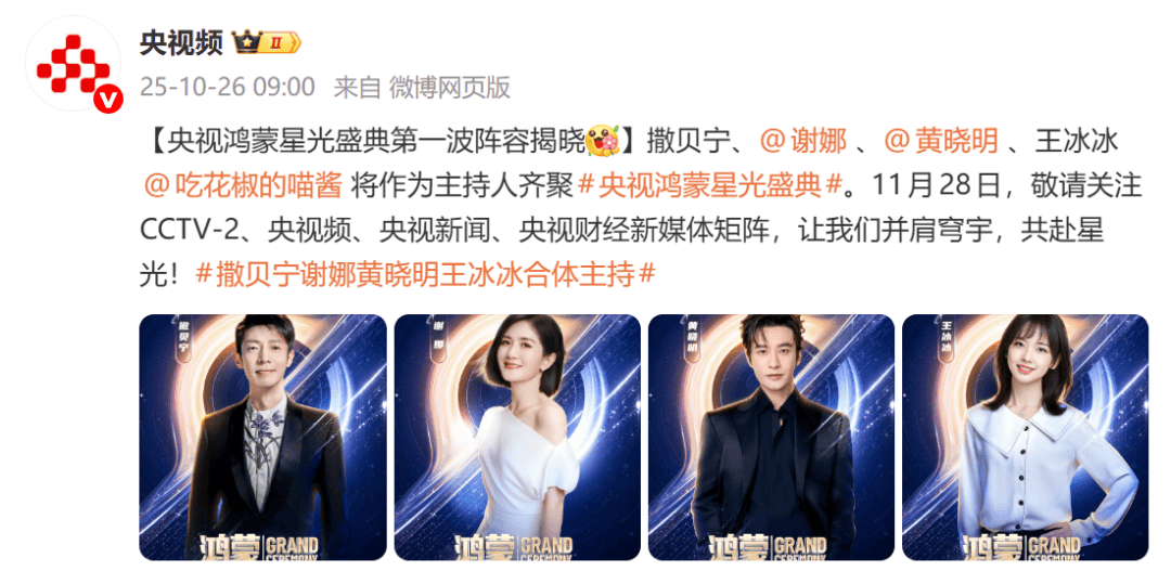 10月26日上午9时,央视频微博发布消息:撒贝宁、 谢娜、黄晓明、王冰冰将作为主持人齐聚央视鸿蒙星光盛典。11月28日,敬请关注CCTV-2、央视频、央视新闻、央视财经新媒体矩阵,让我们并肩穹宇,共赴星光!