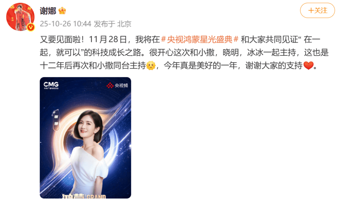 又要见面啦!11月28日,我将在央视鸿蒙星光盛典和大家共同见证“在一起,就可以”的科技成长之路。很开心这次和小撒,晓明,冰冰一起主持,这也是十二年后再次和小撒同台主持,今年真是美好的一年,谢谢大家的支持。