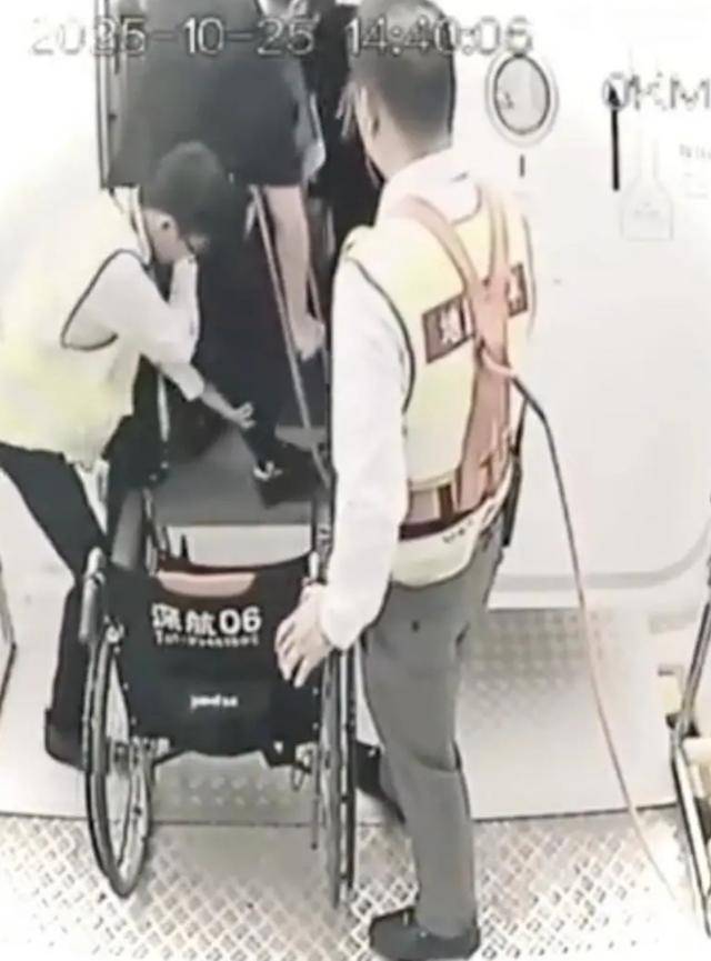 有两名工作人员全程协助,帮他搬运行李、搀扶腿部,整个过程平稳、顺畅。