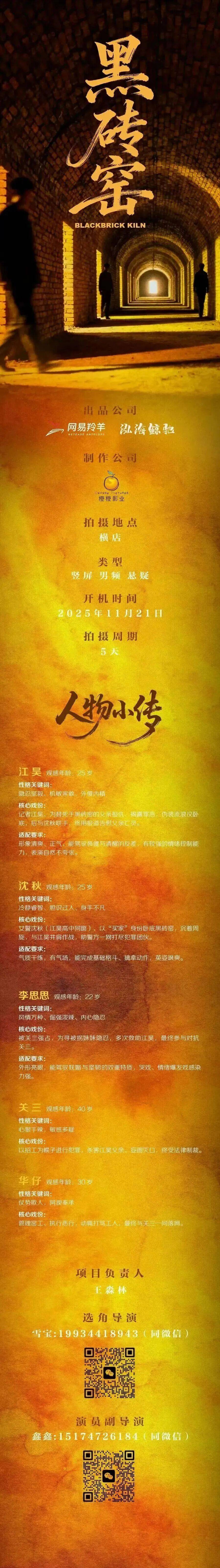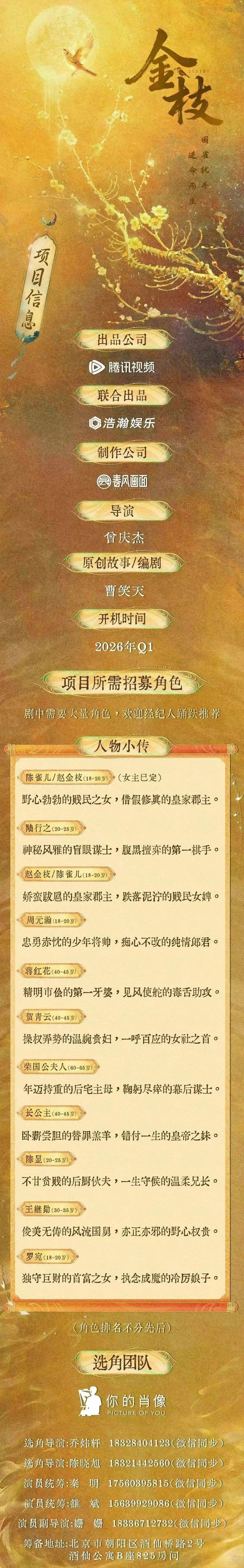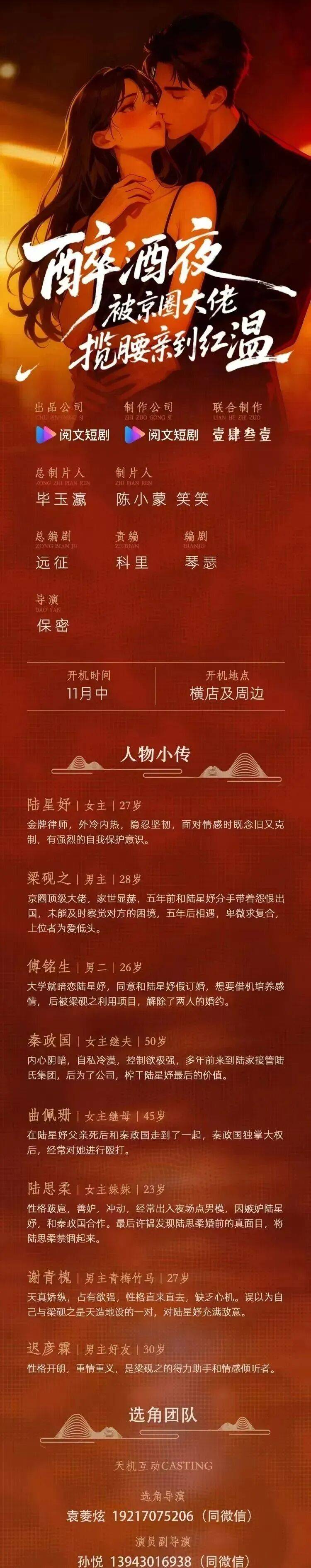 免责声明:戏客Seeker公众号(“本平台”)中全网组讯的信息、内容(“组讯信息”,包括但不限于影视项目名称、项目介绍信息、出品公司信息、导演信息、选角团队信息、拍摄相关信息、联系方式等)均来源于内容信息相关方提供或互联网公开信息。本平台不对组讯信息的真实性、准确性、完整性、及时性、关联性、适用性及安全性提供任何明示或默示的担保。请您谨慎参考或使用组讯信息,并确保您的人身、财产安全,本平台不对您使用或参考组讯信息而造成的后果承担任何责任。