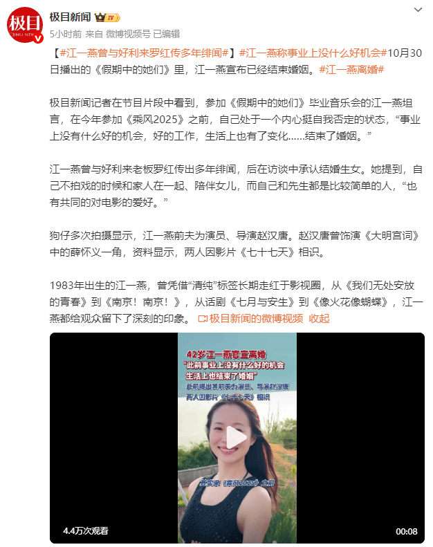 10月30日播出的《假期中的她们》里,江一燕宣布已经结束婚姻。