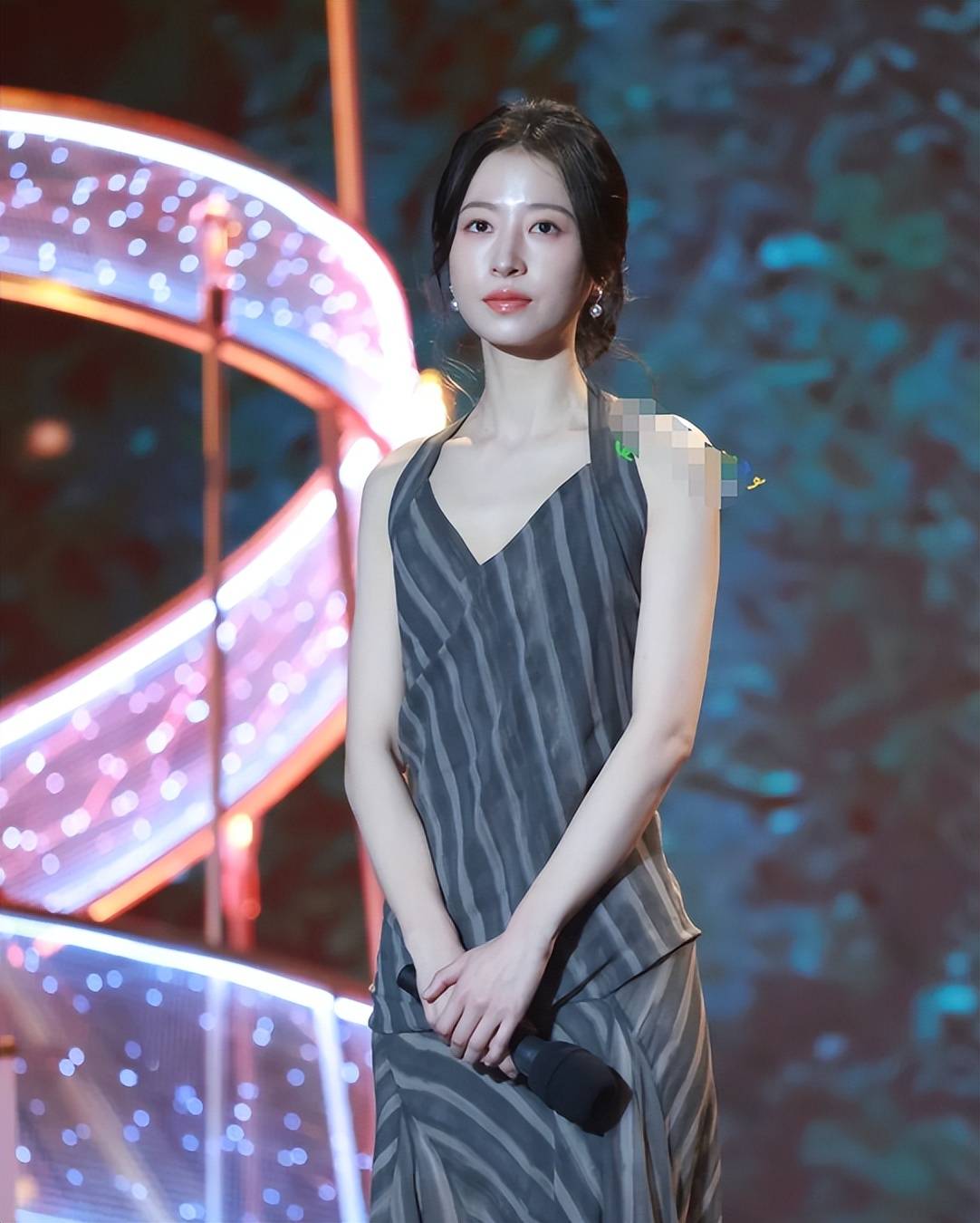 她穿这一身条纹的吊带长裙,紧身设计暴露了她H型身材的短板,尤其是腰部完全没有曲线,亮片在灯光下反光,远看像移动的金属网。