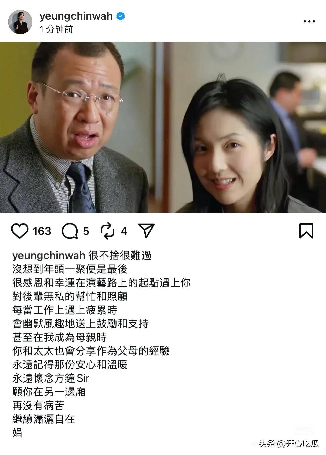 杨千嬅在社交平台发文悼念许绍雄:“没想到年头一聚便是最后,很感恩和幸运在演艺路上的起点遇上你”,“甚至在我成为母亲时,你和太太也会分享作为父母的经验”,“永远怀念方钟sir”,在结尾她署名“娟”。两人曾合作《新扎师妹》《煎酿三宝》,在《新扎师妹》中曾饰演荧幕父女。
