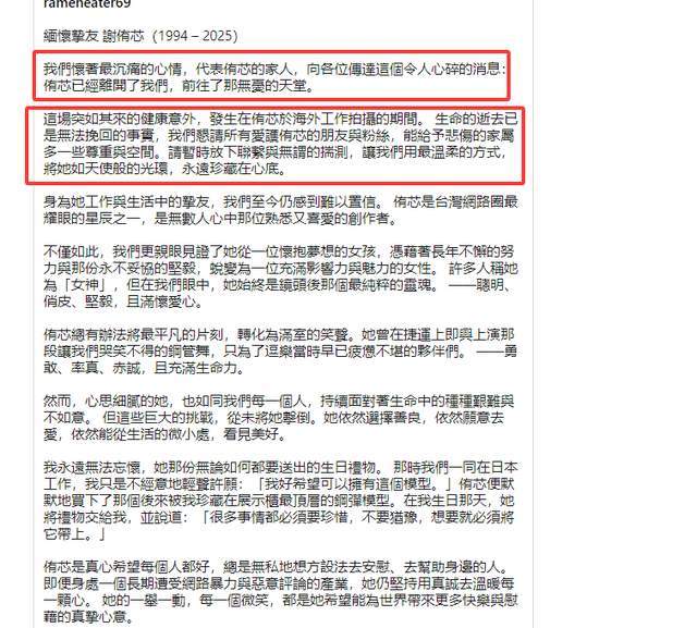 噩耗传出之后,谢侑芯的好友雪碧发文证实这一噩耗,并悲痛表示:谢侑芯是她在网红圈唯一的朋友,心地善良没有架子,也没有任何的利益只有相互取暖。