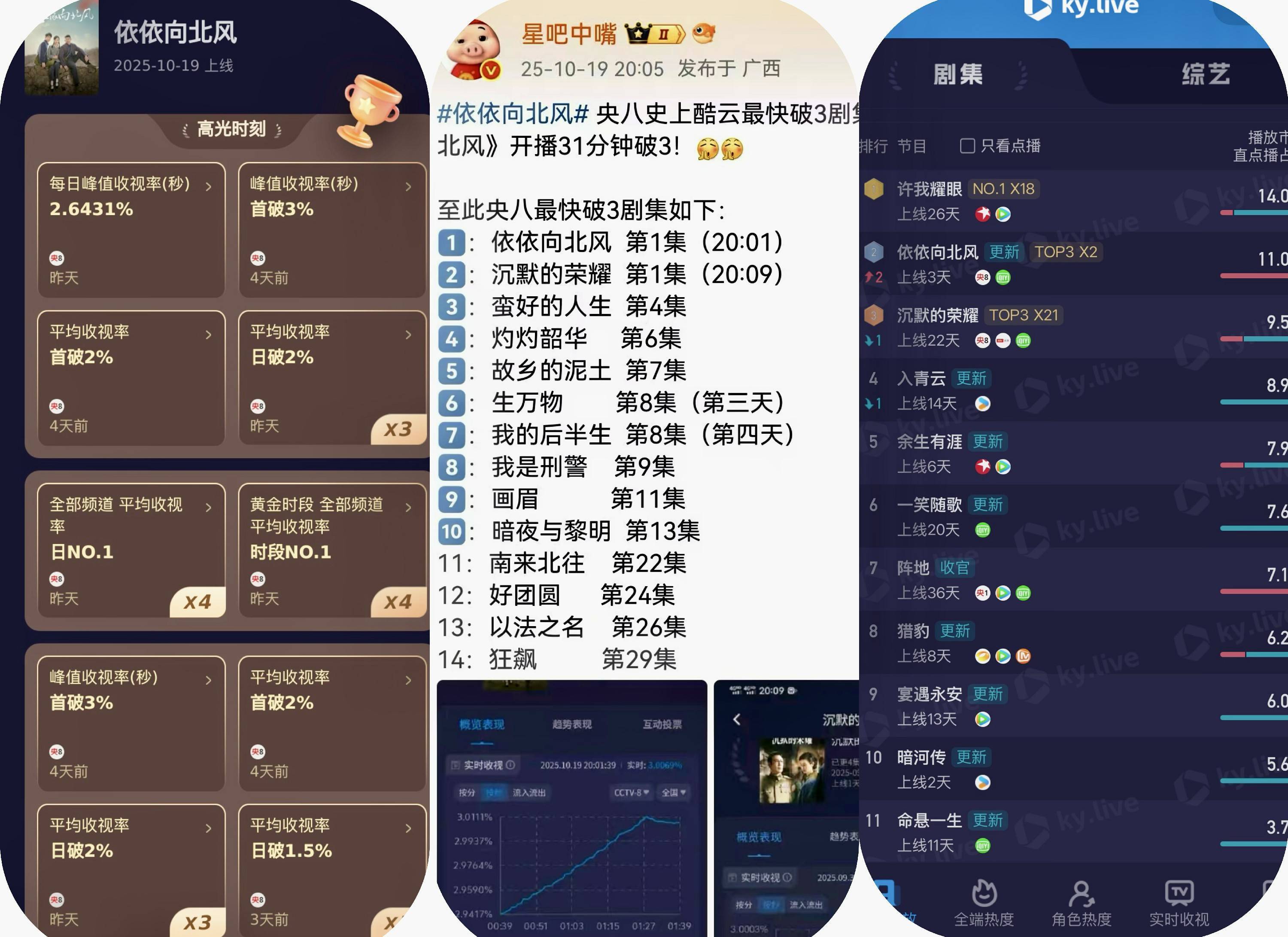 一部名为《依依向北风》的年代剧在2025年10月悄然登陆央视八套黄金档,首播即破3%收视率,播出几天连续榜首强势夺冠,网络热度持续上涨,在一众大剧众杀出重围,遥遥领先。没有仙侠法术没有霸道总裁,只有一群穿着朴实干着农活,为一张返城介绍信和高考复习资料奔走的知青。与常见年代剧的“沉重”不同,《依依向北风》节奏欢快,甚至带有轻松色彩。通过小人物故事展现大时代变迁中的奋斗,有挫折误会遗憾,但更多的是“向上的气”,就像那个年代的人一样,哪怕日子再难,也相信“未来一定会更好”!“一口气追八集,好看!”“真实细腻的笔触,精良的制作拍摄,讲述了一代人的青春记忆。”“ 没有刻意贩卖情怀,也没有苦大仇深,而是通过一群年轻人的命运,串联起知青返城、恢复高考、改革开放等时代节点,展现那个年代特有朴实与艰苦。““父母每天追央八,这才是中国电视剧该有的样子”“真实比“爽”更重要!”“无流量明星、没有浮夸剧宣,已经非常棒!支持!”网友真实口碑出炉!