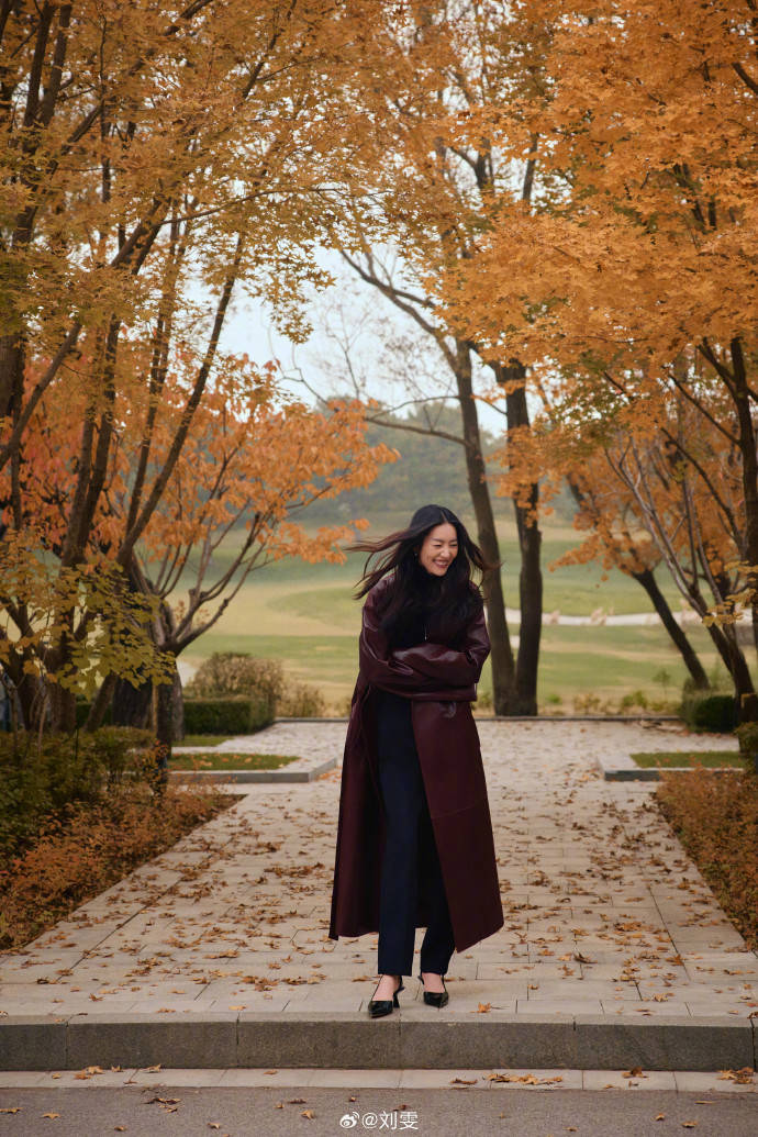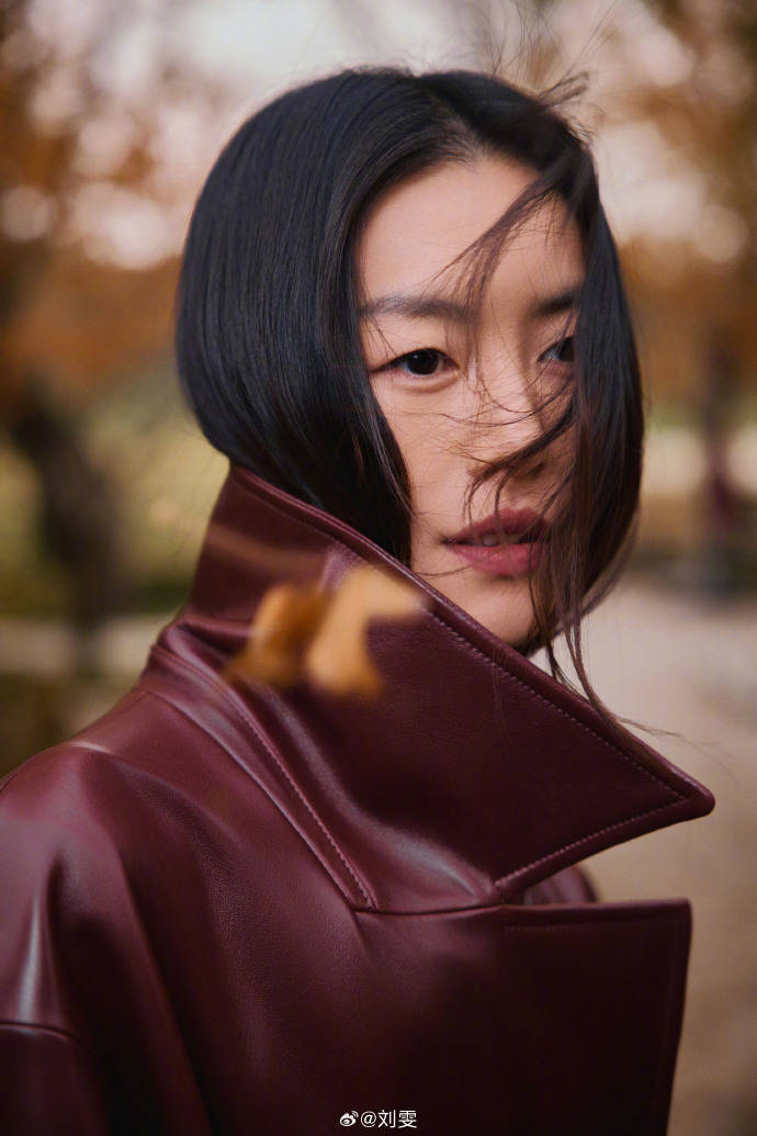 刘雯身穿酒红皮衣,发丝随风飘动,眼神深邃。