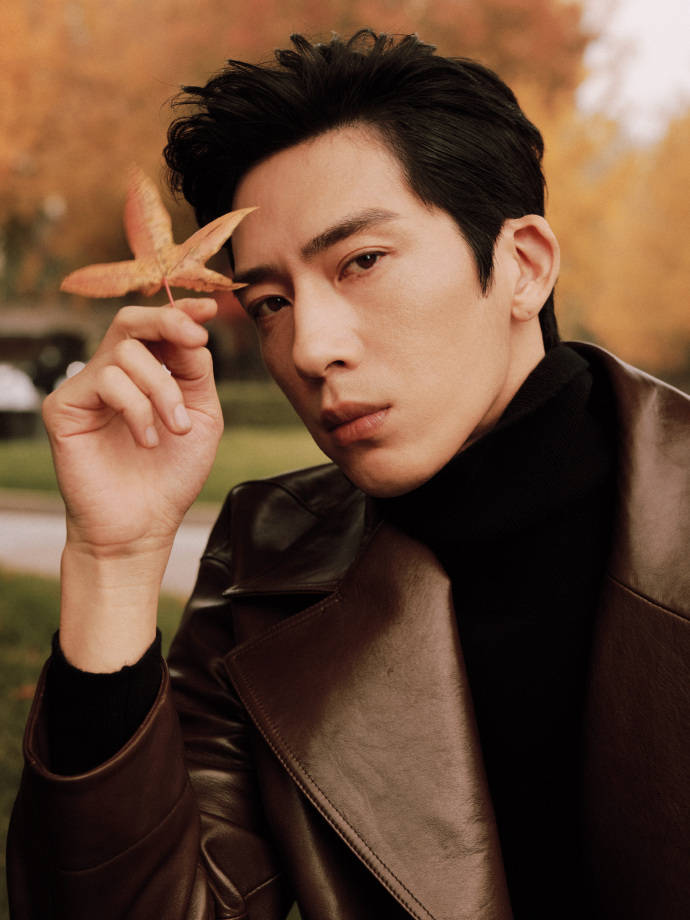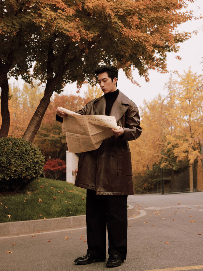 井柏然身着棕色皮衣,尽显成熟绅士。