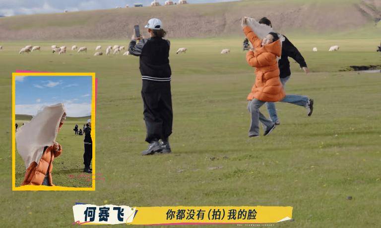 何赛飞让丝巾在风中飘动,同时自己还各种转圈,有点“老年人景点照”的既视感,同时还带有些小幽默。