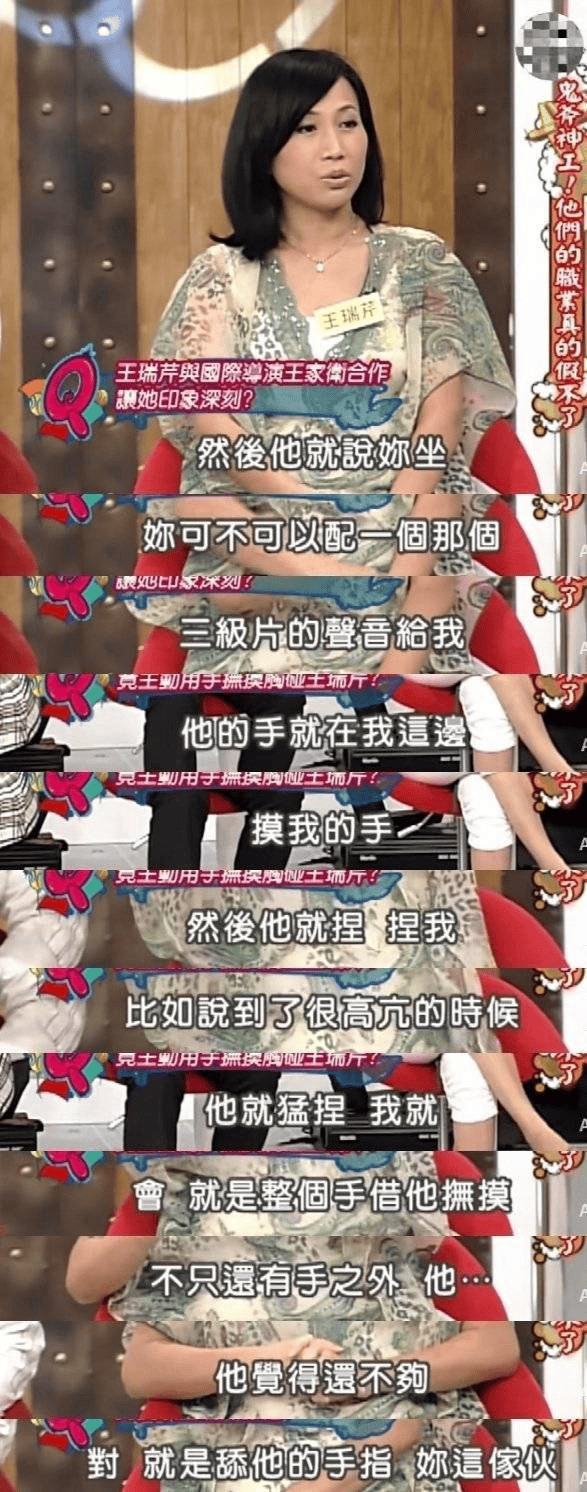 此录音曝光之后,王家卫被骂翻了,网友还扒出早期配音女演员王瑞芹自曝跟王家卫合作,被对方要求配颜色电影声音,过程中还摸她的手,甚至让女方舔他手……