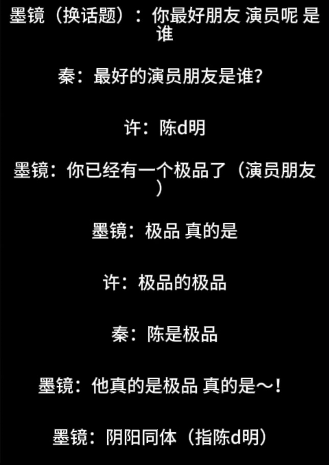 更绝的是,秦雯一面说陈道明是自己圈内最好的演员朋友,一面各种吐槽陈道明,说他爱现场改词,改完又记不下来,王家卫又接话,说他是极品,秦雯跟她的助手也认同,说陈道明确实是极品,这还不够,王家卫又说陈道明是“阴阳同体”。
