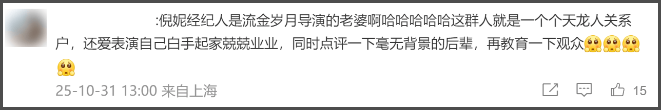然后又牵扯到了倪妮,因为秦雯补了一句“倪小姐也没找过呀”,虽然没找过,但秦雯称自己也“没少管”,一下子把倪妮架在了火上烤,因为一直有传闻称,倪妮经纪人的老公,就是该剧导演,属于夹带私货了。