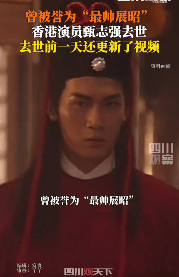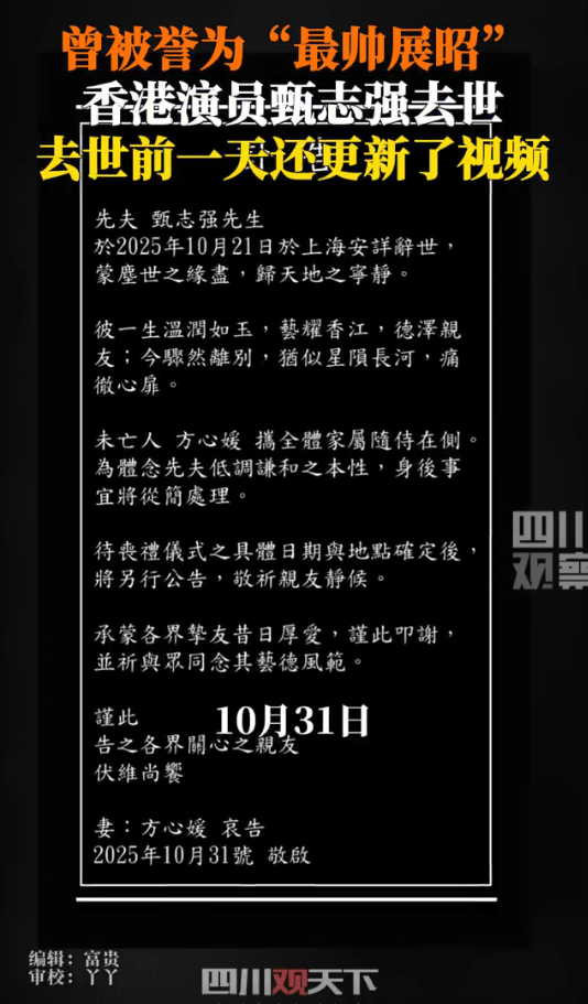 10月31日,香港演员甄志強妻子发布讣告,甄志強于10月21日在上海去世,终年59岁。据了解,他在《碧血青天杨家将》中饰演“最帅展昭”,给观众留下深刻印象。其他代表作有《剑啸江湖》《雪花神剑》《与狼共枕》《郎心如铁》等。