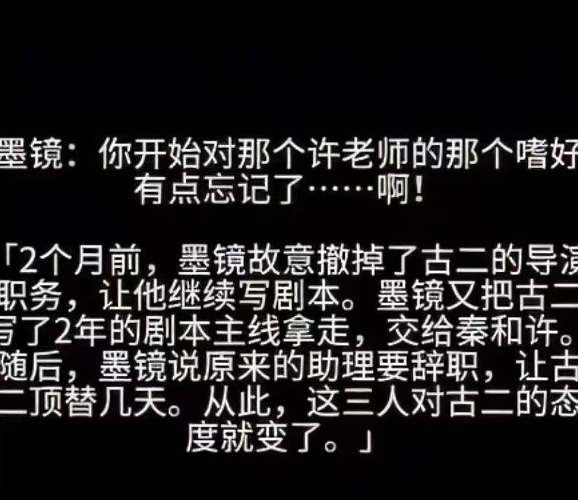 古二又爆料了,他也是很恐怖,居然在工作期间录音了,爆料很多导演王家卫和《繁花》编剧秦雯的一些内幕,一次比一次夸张,之前古二的账号被封禁了,可能他又重新注册账号开始爆料。古二表示之前是导演组的,后来被王家卫安排做编剧,但最终署名是资料编辑,而不是编剧。