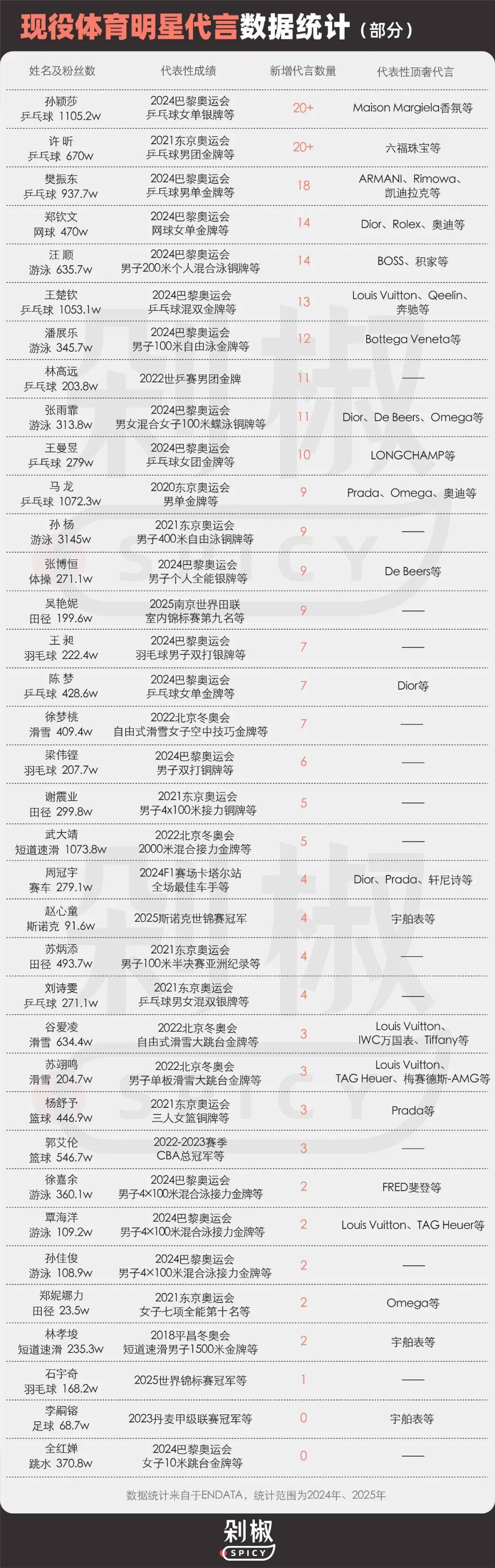 “孙颖莎和王楚钦这类TOP运动员,至少配两个经纪人——总局内一个,总局外一个,所有商务都得过这两关。而且限制不少:快消或美妆合作,别的艺人能配合两场大型直播或活动,他们可能就一场,拍摄行程需要根据训练比赛调整,有时还要额外付费。”一位资深从业者向我们透露了头部运动员的代言现状。