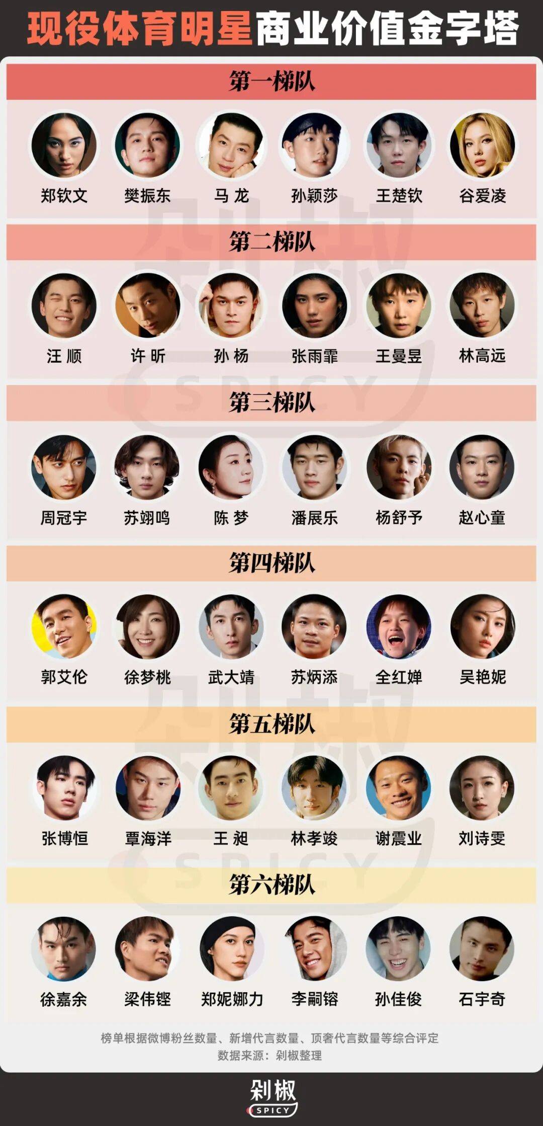 基于运动成绩、粉丝数量、新增代言、顶奢合作、讨论指数等五个维度,剁椒Spicy梳理了2024年以来中国籍体育明星的商业代言情况,并进行了金字塔梯队划分,每一梯队按照近期整体商业价值从左至右依次排列。值得注意的是,高净值圈层影响力与国民带货力虽同为关键评估标准,但难以直接横向比较。运动员的商业价值,核心在于匹配不同品牌的差异化诉求,而非简单的梯队高低。同时,盘点仅涉及运动员的个人代言,未包括其团队代言。