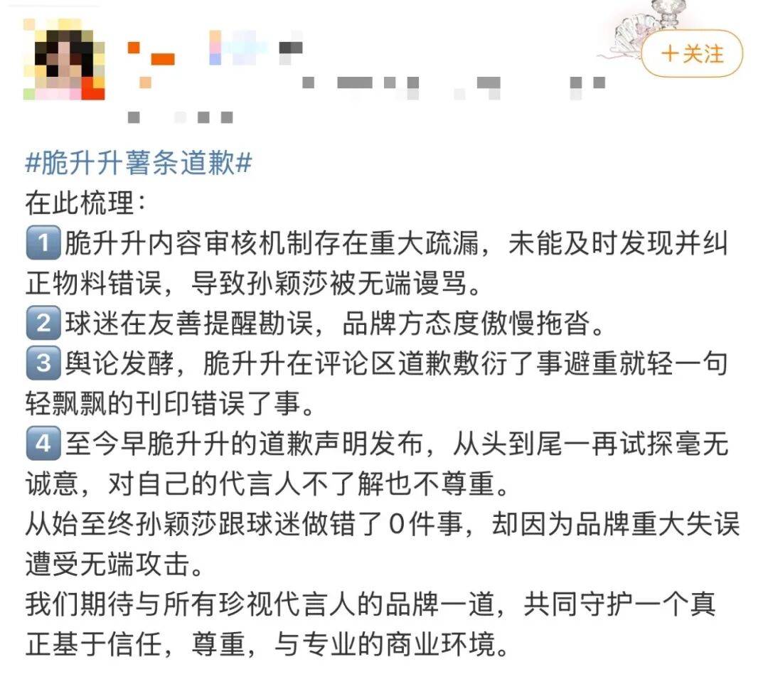 前段时间,脆升升官宣孙颖莎为代言人,本是一件好事,但发放给粉丝的官方周边中出现多处不可接受的严重失误:首先,将孙颖莎名言“奋斗是青春最亮丽的底色”错印成“奋斗是青春最靓丽的底线”,曲解原意;其次,周边中混入指向另一名运动员王楚钦的所谓“废弃物料”,被粉丝解读为品牌“夹带私货”“带头炒CP”博流量。这些错误导致孙颖莎本人遭受无端指责,品牌信任度瞬间崩塌。虽事后道歉并召回,但暴露了执行层面的极不专业、审核机制的形同虚设,以及对运动员形象和粉丝情感的极度不尊重。