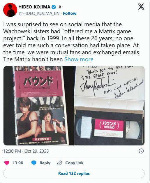 小岛在英文版官推上写道:“我在社交媒体上看到沃卓斯基姐妹(编者注:其实当时是兄弟,那会儿还没有变性成女人)1999年曾“邀请我参与《黑客帝国》游戏项目!”的消息,感到非常惊讶。26年来,竟然没有人告诉我我们之间有过这样的对话。当时,我们都是这部电影的粉丝,也互通邮件。《黑客帝国》当时还没在日本上映,但我已经在美国的影院和试映会上看过。