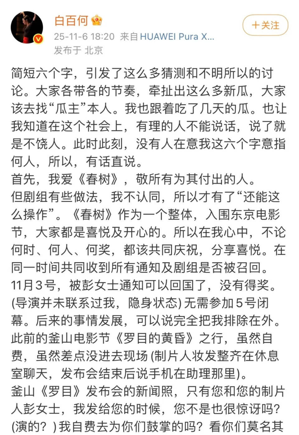 11月6日晚,剧情进一步更新,白百何再次发小作文,解释她没有说王传君获得东京电影节影帝的事,一直说的是导演制片方他们。可是,又有人爆料王传君的老板发朋友圈:善良是选择,不是软弱。不回应不是好欺负,不要把礼貌当成撒野的阶梯。一场大戏,百转千回,吃瓜都吃不过来。