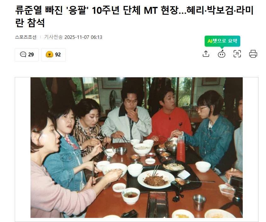 但热闹之余,眼尖的观众立刻发现:全员合照中不见柳俊烈身影。尽管韩媒解释他因“行程冲突”未能参与大合影,但仍单独录制了开场镜头,并与罗美兰、金成钧、安在洪拍了“一家四口”的限定合照,试图弥补遗憾。