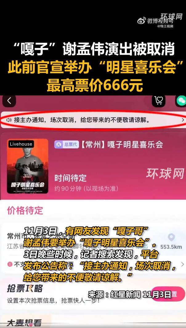 “嘎子哥”谢孟伟的复出大计,还没开场就哑火了。他原定于2025年11月15日在江苏常州举办的“嘎子明星喜乐会”,在11月3日晚间被票务平台一纸公告突然叫停,理由只有短短一行字:“接主办通知,场次取消”。