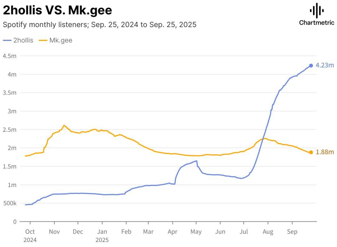 有意思的是,从数据上看,2hollis的增长速度显然更快。如图所示,在2024年,2hollis的月度听众仅50万,明显低于Mk.gee的170万左右。然而,到了2025年9月,2hollis的月度听众数大幅增长,突破423万,尽管没有行业背书,他的表现依然远远超过了Mk.gee。