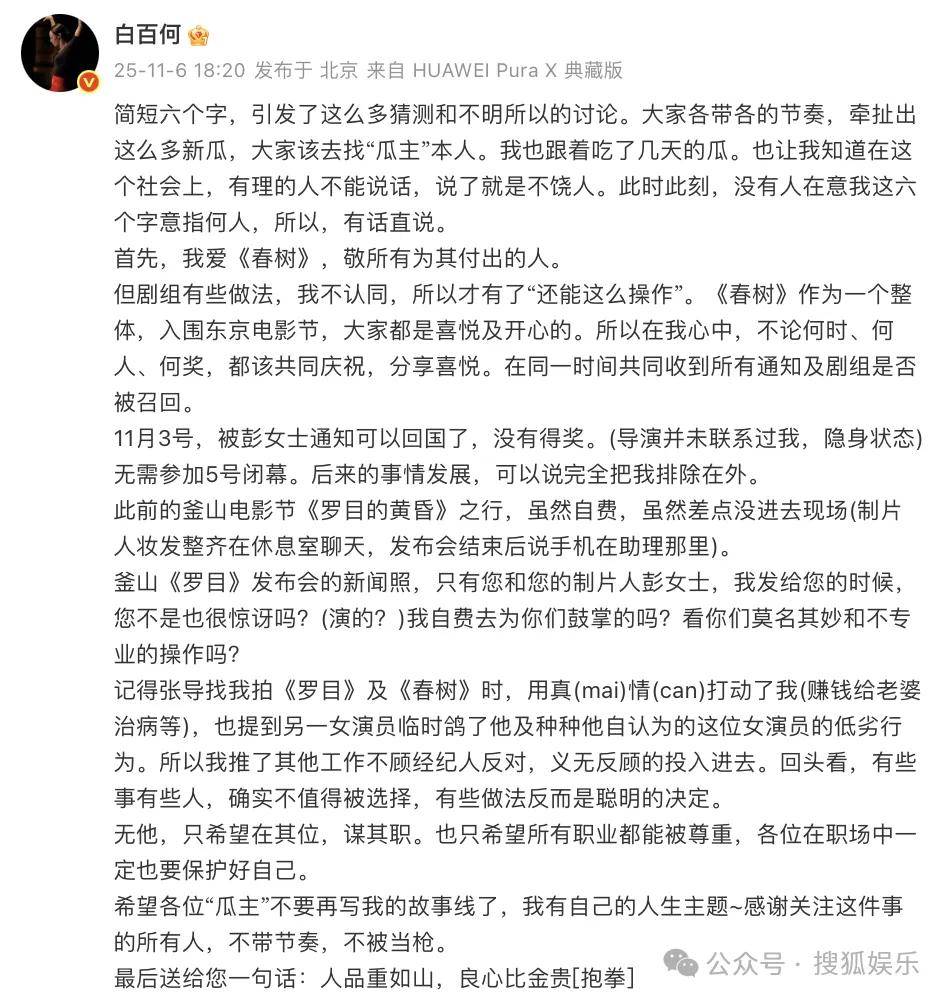 白百何首先表达了对电影《春树》本身的热爱,但明确表示对剧组某些做法不认同。