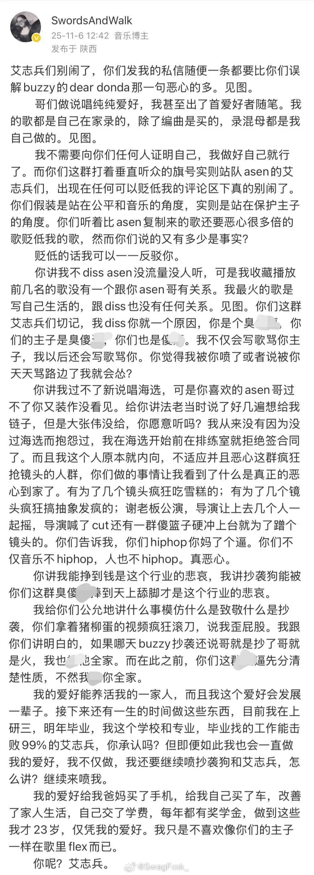 此前在beef大战中疯狂diss Asen的rapper SwordsAndWalk剑走晒出大量私信恶评,并发文回应!
