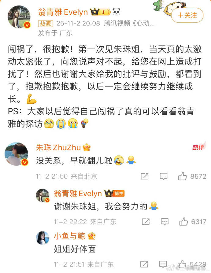 热搜“翁青雅道歉”与朱珠轻描淡写的“早就翻儿啦”,共同拼凑出一场跨界主持风波的全貌。11月2日,因采访朱珠时表现失误而被推上风口浪尖的翁青雅,在社交平台发文致歉,称自己“太激动太紧张”,并对朱珠表达歉意。而朱珠大度回应之下,这场始于11月1日的“社交灾难现场”,却折射出流量时代跨界者面临的严峻考验。