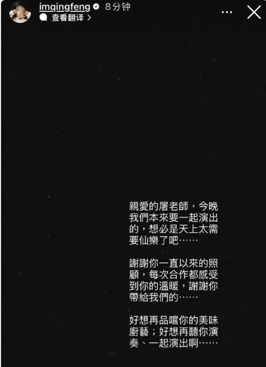 吴青峰:“今晚我们本要同台演出……好想再听您演奏。”