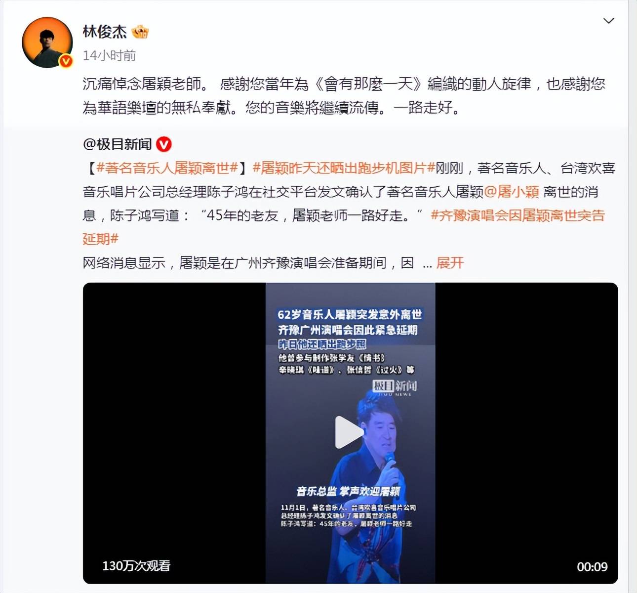 林俊杰:“沉痛悼念屠颖老师。感谢您当年为《会有那么一天》编织的动人旋律,您的音乐将永久流传。”