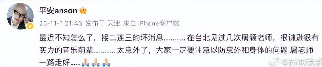 平安:“最近不知怎么了,接二连三的坏消息………… 在台北见过几次屠颖老师,很谦逊很有实力的音乐前辈………… 太意外了,大家一定要注意以防意外和身体的问题 屠老师一路走好……”