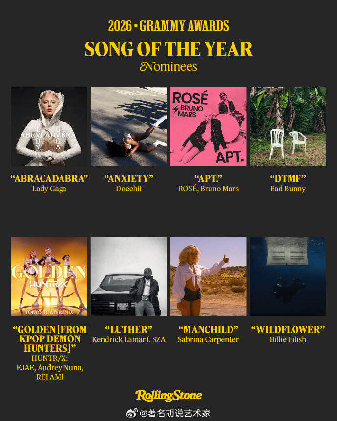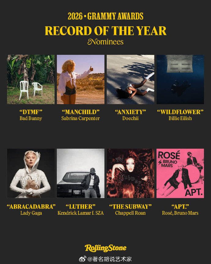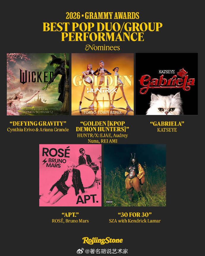 乍一看是“合作共赢”,但细看《APT.》这首作品本身确实有点东西。这首改编自80年代经典曲目《Mickey》的热单,巧妙融合了复古与流行元素,不仅在全球狂揽50多国榜单冠军,更在Billboard全球200强上连续霸榜12周。其共同创作者Amy Allen也一并获得了“年度词曲作者”的提名,足见作品从词曲到制作都获得了格莱美评审体系的专业认可。