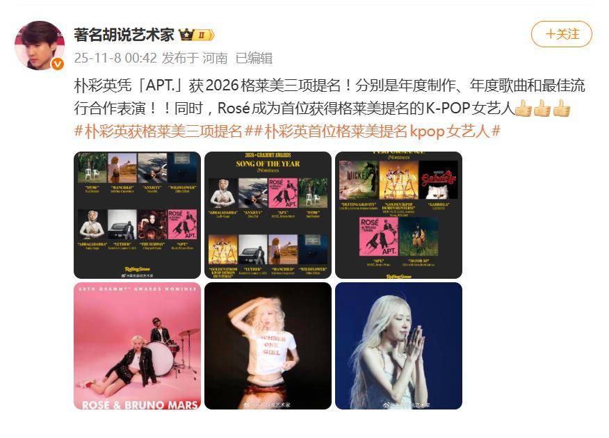11月18日,K-POP圈被一条重磅新闻炸开了锅:BLACKPINK成员朴彩英(ROSÉ)凭借与布鲁诺·马尔斯合作的单曲《APT.》,一举斩获2026年第68届格莱美奖三项重磅提名,瞬间刷新了韩流的历史纪录。