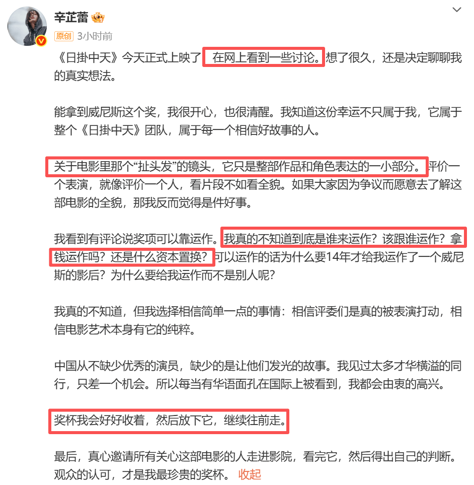 她吐槽的是奖项规则, 又不是针对辛芷蕾,国际电影节有资本干预又不是秘密,奥斯卡不也有游说吗?