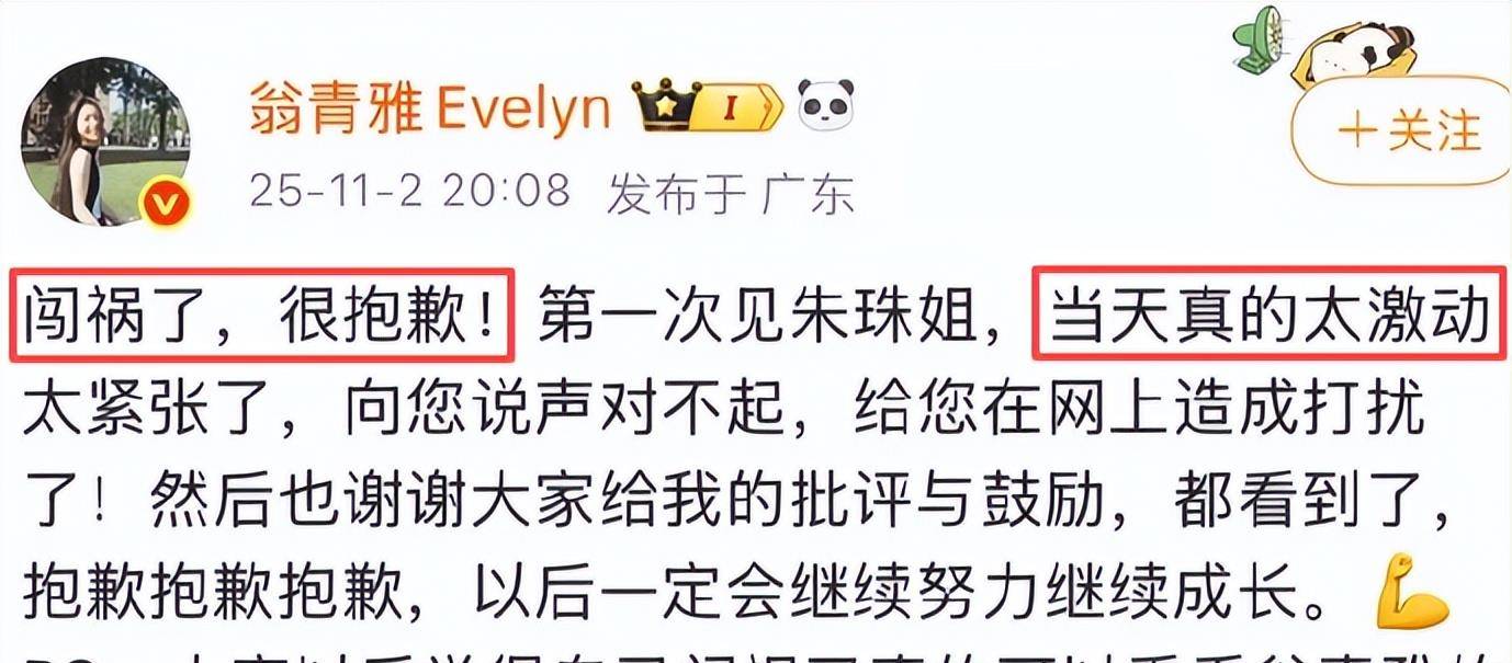 面对批评,翁青雅迅速道歉,将失误归咎于"见到偶像太激动",并自封"闯祸典范"。