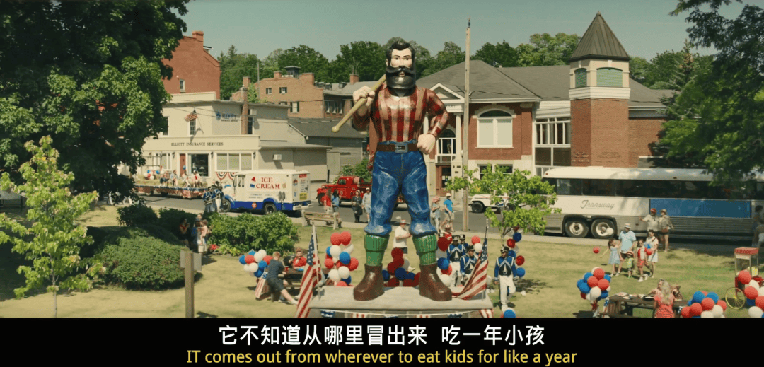 它脸上带着可怖扭曲的笑容,拿着大红色的气球,引诱一个又一个小孩,激发他们内心最深的恐怖,然后把他们吃掉。