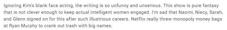 “我没想到现在还能拍出这么烂的电视剧。我一直以为电视剧应该有某种底线,某种不言而喻的制作标准,能让任何新剧都至少达到一定的水准。但我错了。”评论家露西·曼根(Lucy Mangan)说。