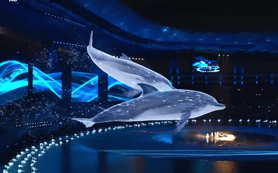接下来就到开幕式文体表演了!第一个节目舞美设计格外惊艳,跳跃的白海豚、飞扬的船帆,是别有风味的渔家风情呢。