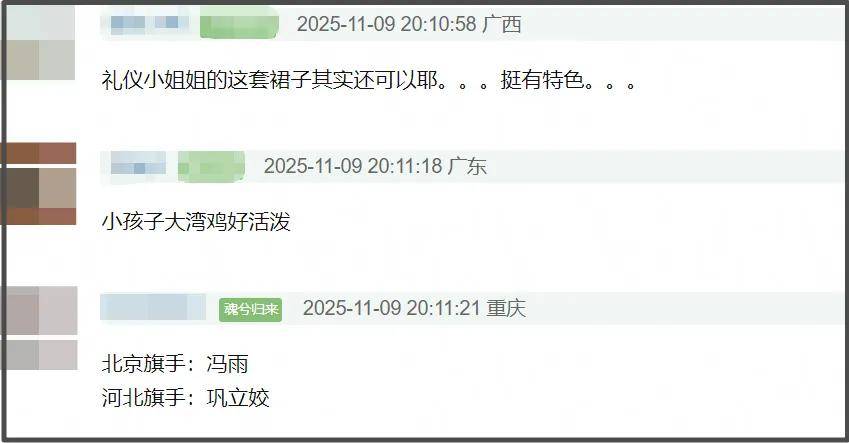 观看入场环节的网友们关注点一个比一个有趣,有人注意到各省市运动员方队旗手,有人注意到礼仪小姐姐裙子好看又有特色,有人注意到十五运会吉祥物活泼又可爱。