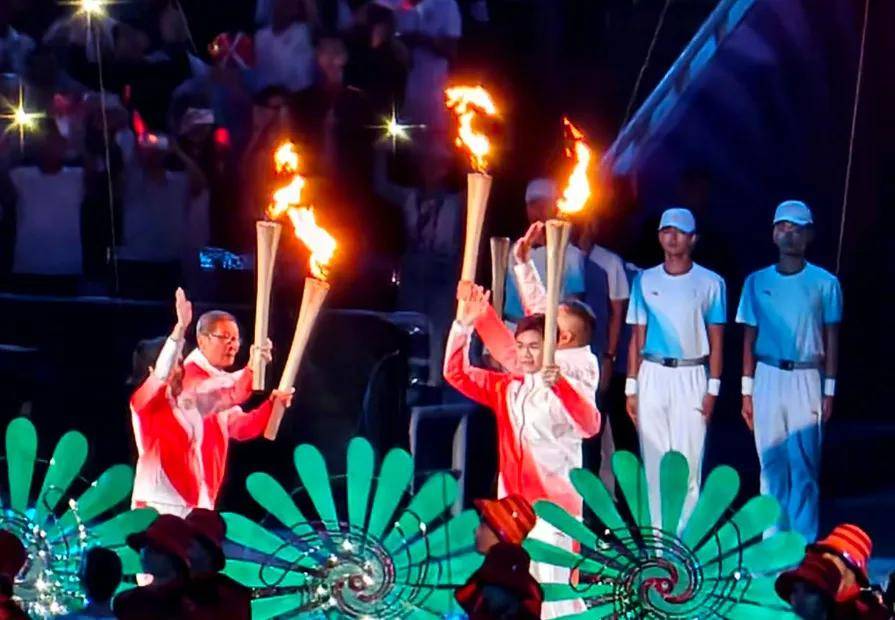 就用水舞台之上的火炬传递来结尾吧,郭晶晶、梁伟铿等运动员现身,新老运动员传承交替点燃火炬,在水中跑起来都带风呢。