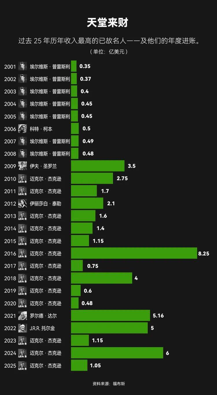 今年已故名人收入榜的收入统计范围为2024年10月1日至2025年9月30日期间的税前收入,包括作品销售、流媒体播放、授权交易及其他来源,以及同期达成或宣布的遗产收购交易所得(这些收入将分配给家人及其他受益人)。《福布斯》根据Luminate的数据及对行业内部人士的采访编制了这份榜单。收入数据中未扣除经纪人、经理人和律师的费用。