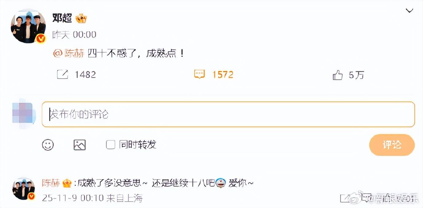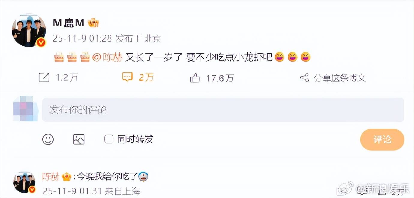 “跑男铁三角”的互动则贡献了另一重欢乐。邓超以老父亲口吻叮嘱“四十不惑了,成熟点!”,遭陈赫犀利回怼“成熟多没意思~继续十八吧”。鹿晗凌晨发文调侃:“又长了一岁了要不少吃点小龙虾吧”,陈赫则俏皮反击:“今晚我给你吃了”。这些充满生活气息的互怼,折射出三人十年未变的相处模式——用最轻松的语气,传递最坚定的支持。