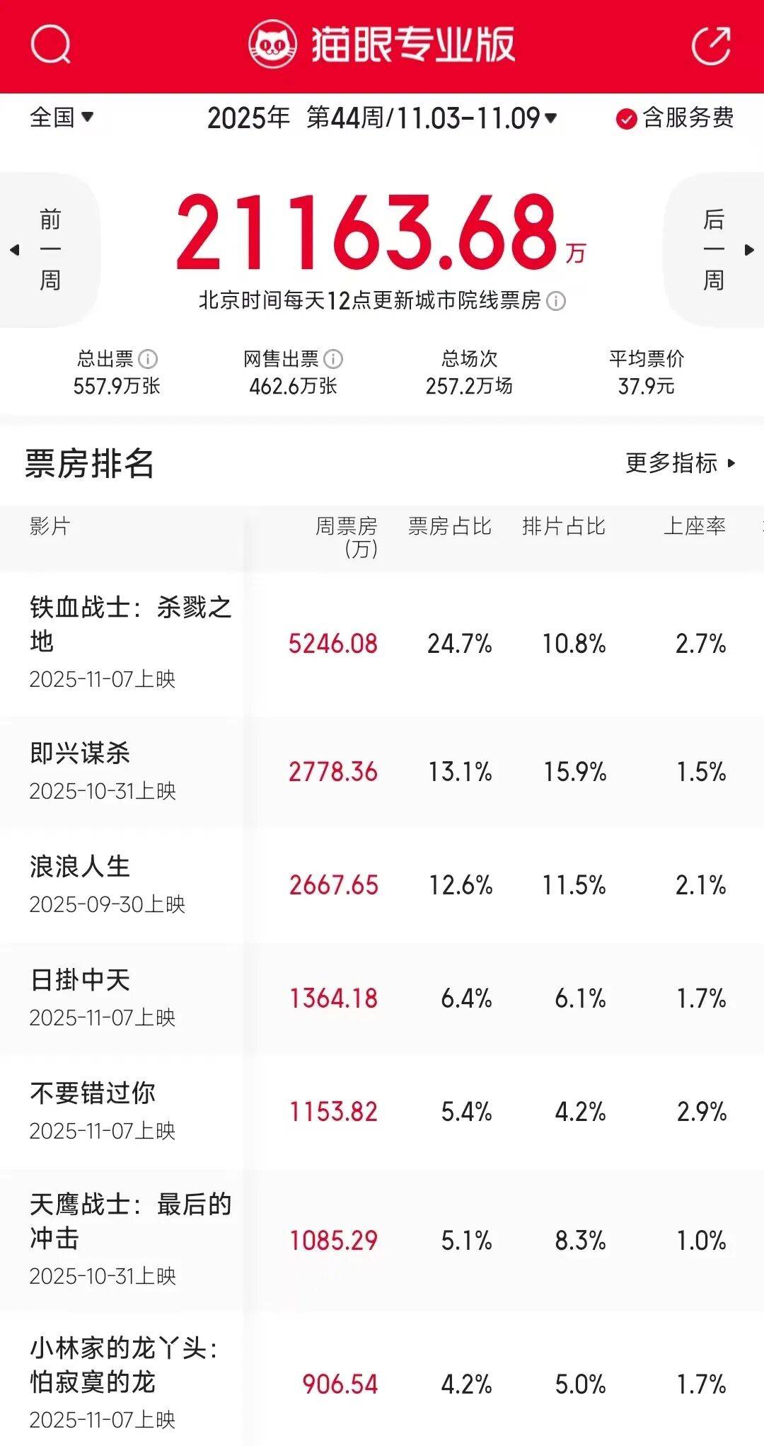 上周新片表现照样是有点不咸不淡,影市热度依旧较低。据猫眼专业版数据,11.03-11.09中国内地一周票房报收2.11亿,较前一周的2.15亿微跌1.8%。