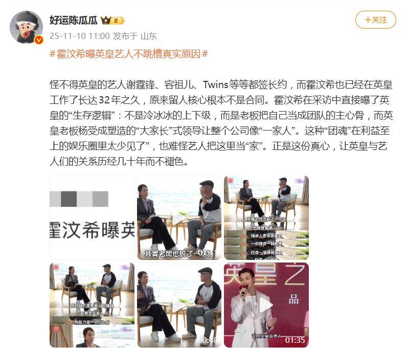 据网友11月10日爆料,霍汶希在采访中曝出的英皇“生存逻辑”,简直给热衷吃“解约瓜”的网友们上了一课。当别的公司还在大谈合约和违约金时,英皇直接亮出了终极王牌:我们这儿,不搞冷冰冰的上下级,玩的是“一家人”模式。