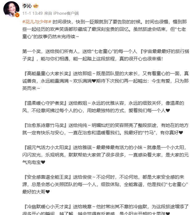 并非所有人都选择长篇大论。李沁早在几天前就为每位成员量身定制了专属奖项,这种独具匠心的告别方式,反而更显用心。而那英虽然文字简洁,但在节目最后的山顶喊话环节,她对陈数情绪的温柔托举,早已胜过千言万语。
